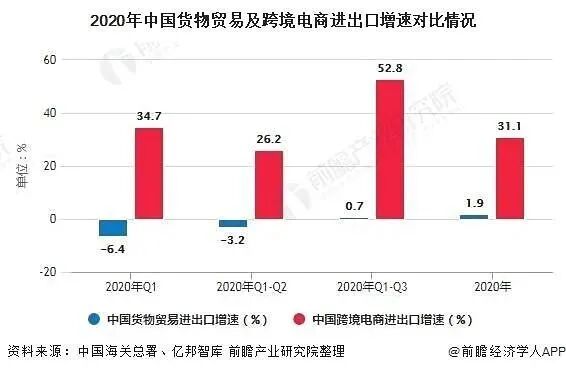 2020年,受疫情冲击,货物贸易进出口一度停滞,而跨境电商进出口在前三季度达到了52.8%的增速,全年达到了31.1%。