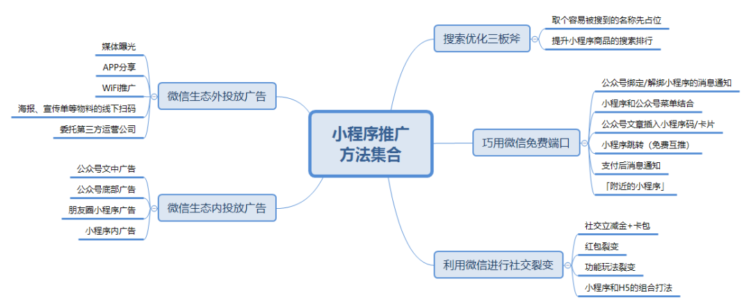 最后,我们用一张思维导图总结下小程序的21种推广方式: